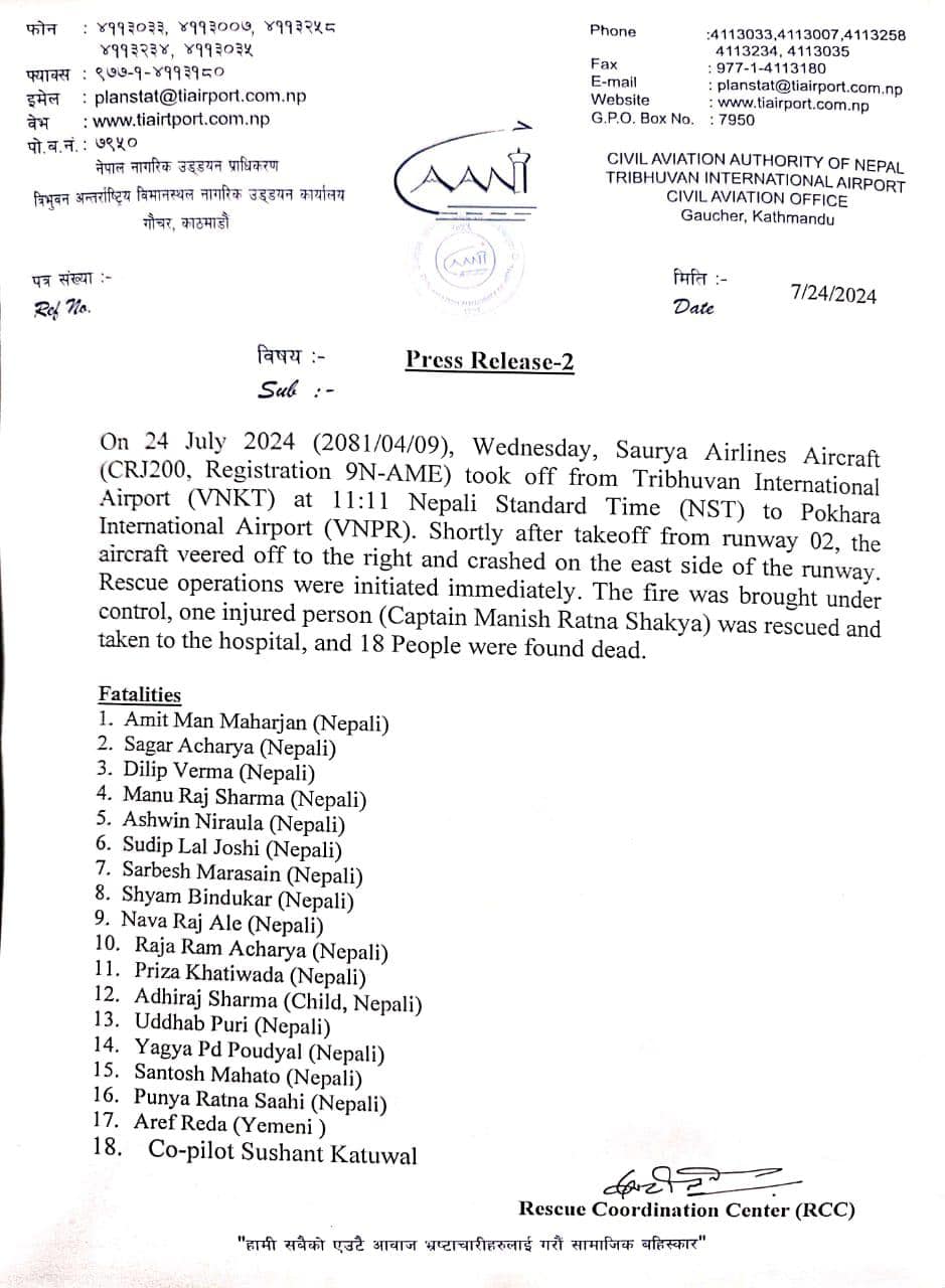 विमानमा सवार १८ जनाको शव यत्रतत्र छरिएर रहेका अवस्थामा सङ्कलन गरिएको विमानस्थल सुरक्षार्थ खटिएका वरिष्ठ प्रहरी उपरीक्षक डम्बर विकले जानकारी दिनुभयो । उहाँले सङ्कलित ती शव अहिले त्रिभुवन विश्वविद्यालय शिक्षण अस्पतालमा लैजाने तयारी गरिएको बताउनुभयो । प्रहरी उपरीक्षक विकका अनुसार सो विमानका चालक दलका एक सदस्यलाई जीवितै उद्धार गरिएको छ ।
