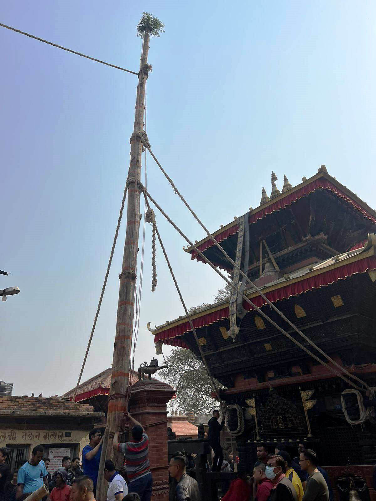 पचपन्न हात लामो लिङ्गो तान्त्रिक विधिपूर्वक दशकर्म विधान गरी आज एक घण्टाको प्रयास पछि ढालिएको थियो । लिङ्गो ठड्याउनु अघि लिङ्गोको कोखा (टुप्पो)मा नाग र नागिनीको प्रतिकस्वरूप दुईवटा विश्व ध्वजा बाँधेर अष्टमातृकाका प्रतिक आठ वटा डोरीले तानेर उक्त लिङ्गो ठड्याइने प्रचलन रहेको छ । त्यही आठ वटा डोरीले आठ कुनामा बसेर लिङ्गो ढालिएको थियो ।